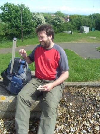 After Detling Hill G/SE-013 on Sunday 25th May 2008, the JimNav took me straight back to Junction 7 of the M20, and down the motorway to Folkestone. Radio stations heard on the route included 106.0 KMFM Canterbury and other KMFM outlets on 96.4 and 106.8. Jimmy directed me up to the village of Paddlesworth and around to the cul-de-sac lane up to Sole Farm. I checked at the farm, and they advised me to park in front of the gate to the covered reservoir, because "The Water Board have already been up today". We went through the gate and took the customary photos as we posed by the trig point. We continued further and looked for a suitable place from which to operate in this large activation zone on Cheriton Hill G/SE-015.