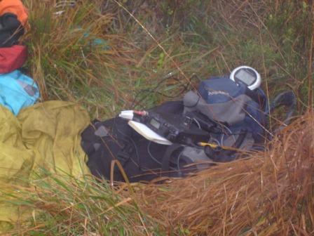 We walked up a track beyond a large double gate, which soon curved around to the left and behind a house where the pre-warned about barking dogs did not disappoint. We climbed gently through a field full of bullocks and curved around to the right towards the large looming hill ahead. An upwards groove and a stile matched well with the research Jimmy had done in previous weeks, and we pressed on aiming generally upwards. The final climb onto the summit was rocky and scrambly, and three point contact and a bit of effort was required. As we hit the summit, we looked despairingly across the misty valley to see an even higher hill looming ahead and above. Dejected, we hauled our now tired bodies across in that direction, but Jimmy soon found that the mist was playing tricks on us, and that in reality, it was just a small lump on the same summit area. Furthermore, he was able to confirm that the first summit reached was the 'true' one. He returned there to set up for 2m FM, while I used the shallow saddle between them, about 10 to 15m below, to play HF with more shelter from the weather.