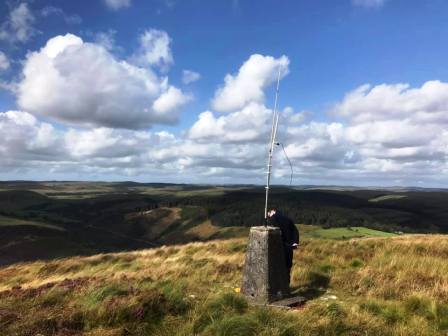 It was a pleasant mild afternoon, and shirt-sleeve order for me. I set up the SOTAbeams Bandhopper 4 linked dipole beside the large summit cairn, but not to full length as i had no intention of using the 80m band. I qualified easily on 40m CW. Jimmy meanwhile had only been able to manage two QSOs on VHF, so he completed his activation on my set-up, using 40m SSB.