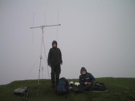 In the morning, we set off on foot from the hostel and retraced our Pennine Way route from weeks earlier, heading left and to the north of Dufton Pike. Soon into the walk, we heard Myke G6DDQ/P calling from the summit of Cross Fell G/NP-001. This was impressive, given that he had left the hostel at a similar time to us; we had the bulk of Dufton Pike still towering above us! We had noticed a possibly easier way onto the hill from this side and were keen to investigate. In actual fact, this was not the case, as the route was just as steep, but longer and more time consuming. Nonetheless, we topped the hill and set up, despite the increasingly wet conditions. Some low cloud swirling below the summit in the wind had Jimmy and Liam excited at the prospect of a cloud inversion, but the thick grey cloud above put paid to that!