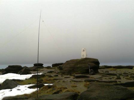 The starting point was the lay-by at SK091824 on the Sheffield road out of Chapel-en-le-Frith. I passed through the Pennine Bridleway gate at the end of the lay-by, but immediately away from that track, to follow a concessionary footpath parallel to the road. This took me to the start of the Chapel Gate track (marked as a by-way) at SK093825. I followed this wide track gentle uphill. The entire width of the track was filled with deep snow, and so I had to make my way atop the steep bank on its right-hand side. After the gate at the top, things were much easier - initially at least. I followed the track as it turned left (north), signpost as "Edale via Barber Booth", but left it quickly as it curved right. I now followed a faint trodden path in a NNW direction, marked as a dotted line on the OS 1:25000 map. From this point, the line of the path was usually easy to see on the groun, but usually needed to be avoided, as it was in (or had formed) a trench, that was mostly full of water, or snow, or both. Some particularly boggy bits needed to be negotiated carefully, and then care taken to pick up the line of the path again. This seemed like a long and rather lonely walk in featureless, rather desolate terrain, and in limited visibility. The only thing on the horizon was the brick structure marking the top of an air shaft for the Cowburn railway tunnel passing beneath. When the land in front of me began to gently rise again, I hoped I was approaching the summit of Brown Knoll, 569m. Therefore I was more than satisfied when the trig point came into view. I had to cross a tricky bit of bog to get to it, but I did for the photo. And as I realised that I was within 25m of TP1707, I thought about activating it for the WAB Trig Points award. Well I didn't have an SSB rig with me, so I couldn't do the honours with the net on 7.160MHz. Instead, I took the selfish approach of getting a QSO on 2m FM with the HT, so I could tick the trig as activated myself! Arthur G0OHY answered the call; no-one else did, and I got on my way. I took a compass bearing, which confirmed that the way I was instinctively heading was correct and ambled downhill.