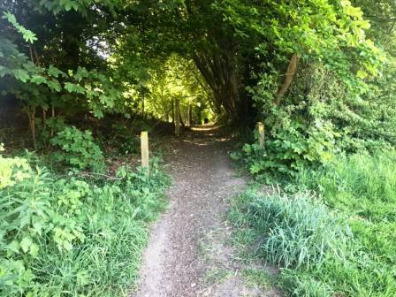 The path turns sharp left to continue behind the school. After a kissing gate, the engineered path ends and suddenly the terrain can be very muddy. The path goes into Big Wood, rejoining the original route of the right of way before it was necessarily diverted due to the King's School development.