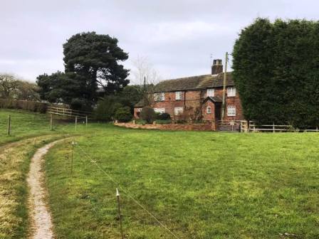 At Highlane, turn left to follow the PROW up to Mollards Farm. The main PROW passes through the farmyard here, but the landowner has installed an alternative route around the boundary. It is quite narrow between tree branches and an electric fence! On the other side, Mill End Farm is passed through, following which a long winding access track is followed all the way up to the Gawsworth end of Marton Lane.