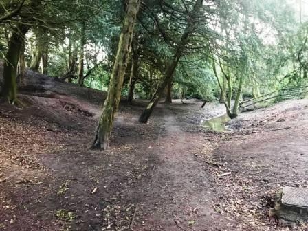 After crossing a small wooden footbridge, this eventually leads out onto Tytherington Drive. Cross directly over this road into Salisbury Place, which has a small cluster of trees and a brook in its centre.