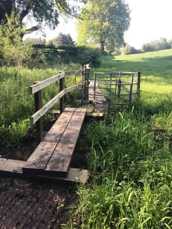 After passing a pond on your right, continue to follow the path on the right hand side of the field. Avoid the temptation to follow the path dropping to the left as any lost height will have to be soon regained. The line of the PROW heads towards another kissing gate in the right-hand corner of the field ahead, but the trodden path on the ground begins to veer left. At this point, trust the path on the ground. This heads through an open gateway into the next field on solid ground, whereas the area just beyond the kissing gate is so boggy as to be usually waterlogged!