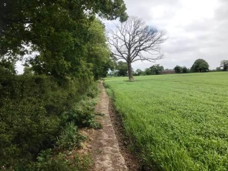 The public footpath turns to follow in a very straight course across a corn field, leading to the back of Goostrey Primary School.