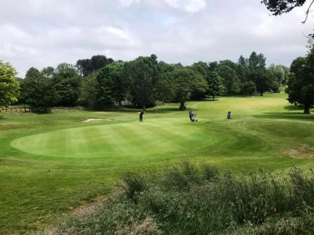 The public right of way across the golf course is followed using a series of wooden marker posts, but generally you are heading up towards the clubhouse which is visible throughout. The path passes to the right of the clubhouse and car parks and continues on a rough path behind a row of houses.