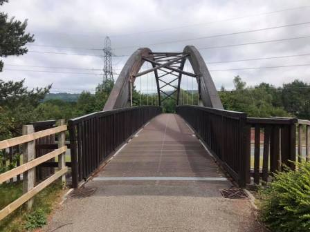 The footpath weaves its way around, rejoining and crossing the residential road a couple of times. Eventually it follows alongside the main A523 "Silk Road", and then cross a rather impressive footbridge.
