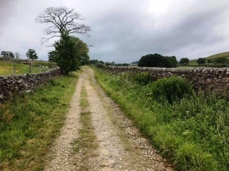 Follow the rough road past the farm and turn left onto another track. At the buildings, a public footpath passes to the left.