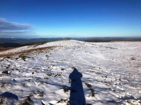 We parked in the big car park at the farmhouse and paid the £5 parking charge into the honesty box. Liam and I set off up the main track that follows the curving ridge line around, all the way to the summit. The air was cold - around freezing point - but with zero wind, cloud free skies and bright sunshine, it felt much warmer than that. It truly was a glorious day for walking. Of course much of the ground was frozen meaning that there was no boggy sections to negotiate, so the walk was very easy indeed.