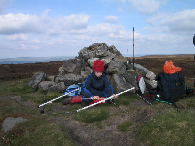 This was my third time up here, but a first for Jimmy and Liam. We headed out of Skipton on the A65 towards Ilkley, then turned right (south) to get to Silsden. From here, it was just a case of following my nose and memory, and without too many false leads we found the road signed "No vehicle access after 1.75 miles" or words to that effect. We parked here in the large space bny the transmitters, and set off through the gate and over the moor to the trig point. This was the only boggy one of the day, with the earlier two being refreshingly bone dry. Still, it was an easy 20 minute horizontal walk in, and we were soon at the large cairn and trig point. This was the only summit of the day without shelter, but thankfully the wind had considerably dropped by now.