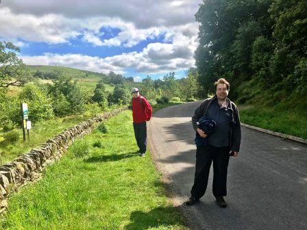 The path now joins the road down to Lamaload reservoir, which you walk down all the way until the reservoir is to your left. Look out for a public footpath leading off to your right by the Hooleyhey road sign. I was intercepted here by Richard G3CWI who brought me a very nice piece of Pandan Chiffon cake!