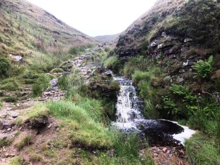 At the junction of paths, bear right to follow the track through the gate, passing a waterfall on your left.