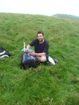 mountain bikes, so I was assured that this route was OK for public access. The summit itself was out of the trees in a corner of a field. We set up the 80m dipole antenna on the fishing pole, and I kicked off on 3.557MHz CW. Just seven contacts were made before things went quiet, so Jimmy took over and called on 3.659MHz SSB. He made four contacts, and then there was nobody else calling him either! Not to worry, there were other summits to do today. We descended a different way, down a small but steep-in-places path through the woods, more or less straight down to the car without touching the forest roads. Jimmy directed me back to the A66, and off to Great Mell Fell G/LD-035. Thanks to the following stations, all worked on 80m with 5 watts: